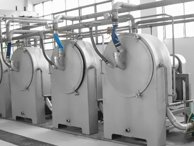 设备运行工作时,薯类乳液由门盖上的进料导管进入旋转的锥形筛篮底部,在离心力的作用下,乳液均匀地沿着筛面分布,并向大径方向运动。在锥形筛篮内,乳液表面受切线、法线两个方向力的共同作用,沿内锥面做较复杂的曲线运动,或者翻滚,到达锥形篮外缘,被离心力作用而向四周溅射,落入集渣室。而淀粉颗粒直径小于筛网网眼或隙宽,在离心力和重力的作用下,透过网眼或缝隙,一部分直接落入集粉室;另一部分向机体背壳溅射并沿着背壳下滑,落入集粉室。 由于锥形筛篮的前面和背面都设置了喷水的喷嘴,能够均匀地向筛篮喷洒稀释水,以将薯液中的淀粉颗粒冲洗出来,同时喷水也能提高淀粉颗粒和细纤维(薯渣)的运动速度,促使粉、渣分离,提取淀粉。